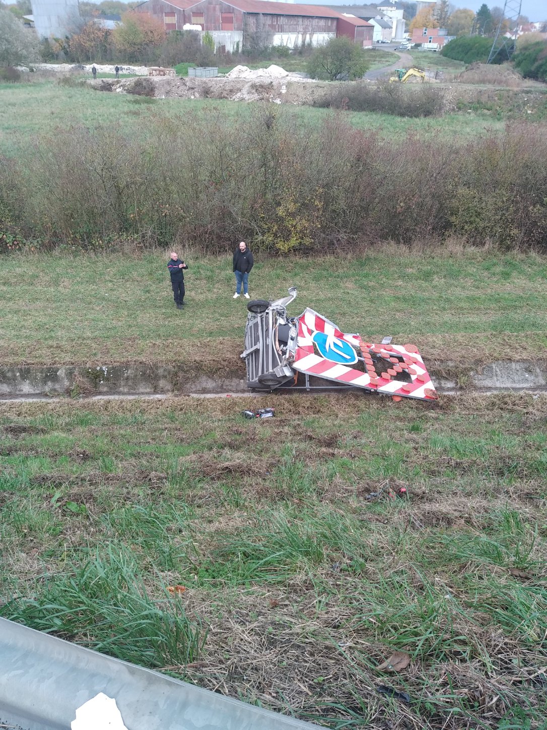 Vers 15h30, la flèche lumineuse de rabattement (FLR) ainsi que le fourgon qui la tractait ont violemment été percutés par un poids lourd avant de terminer en contrebas de la route.