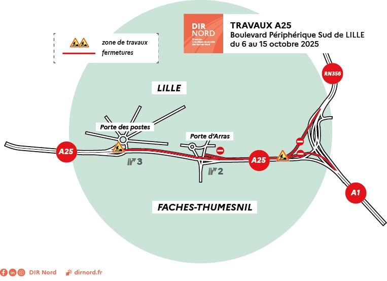 Travaux A25 - Boulevard périphérique Sud de Lille, du 6 au 15 octobre 2025
